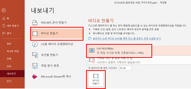 : [파일]→[내보내기]→[비디오 만들기]→[Full HD(1080)]→[비디오 만들기]