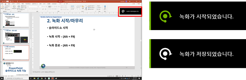 - 16:9 외 모니터 사용 시, 슬라이드 쇼 외부 영역까지 녹화 됨